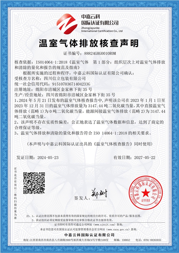 根据企业发展需要,现对CFP:纸质包装箱、包装盒的生命周期的产品碳足迹;GHG:组织边界范围内【四川省绵阳市涪城区金家林下街35号的糖果直播平台】所涉及的温室气体碳排放管理相关活动等相关认证核查予以公示,接受社会监督。
