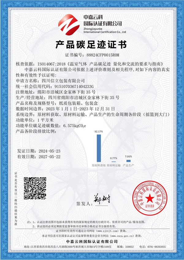 根据企业发展需要,现对CFP:纸质包装箱、包装盒的生命周期的产品碳足迹;GHG:组织边界范围内【四川省绵阳市涪城区金家林下街35号的糖果直播平台】所涉及的温室气体碳排放管理相关活动等相关认证核查予以公示,接受社会监督。